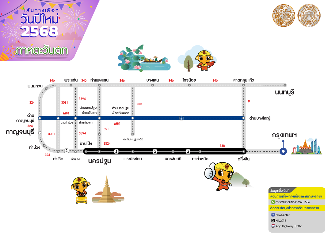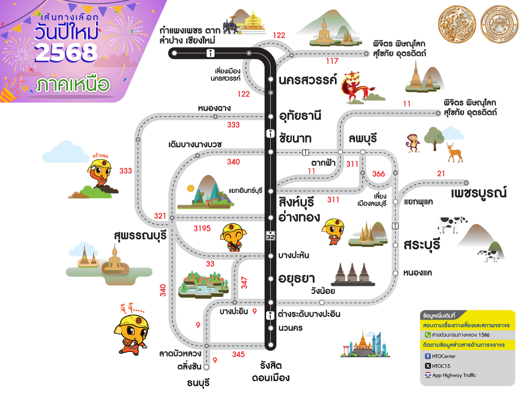 กรมทางหลวง แนะนำเส้นทางเลือกให้กัประชาชนในช่วงเทศกาลปีใหม่ระหว่างวันที่ 27 ธันวาคม 2567 – 2 มกราคม 2568 เพื่อเป็นการอำนวยความสะดวกแก่ผู้เดินทางและหลีกเลี่ยงปัญหาการจราจรติดขัด และช่วยให้ประชาชนวางแผนการเดินทางล่วงหน้าได้เป็นอย่างดีบนทางหลวงสายหลักและสายรอง ดังนี้