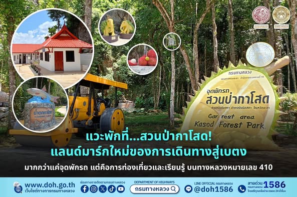 กรมทางหลวงโดยแขวงทางหลวงยะลา ขอเชิญชวนนักเดินทางสัมผัสกับจุดพักผ่อนและสถานที่ท่องเที่ยวแห่งใหม่ "สวนป่ากาโสด" ตั้งอยู่บนทางหลวงหมายเลข 410 ช่วงกิโลเมตรที่ 81+327 ถึง 81+992 ในอำเภอบันนังสตา จังหวัดยะลา เพื่อยกระดับมาตรฐานทางหลวงเพื่อการท่องเที่ยวและรองรับการเติบโตของระบบขนส่งในอนาคต